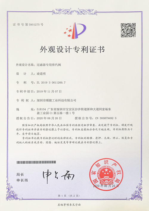 -> 過濾器專用排氣閥外觀設計專利證書