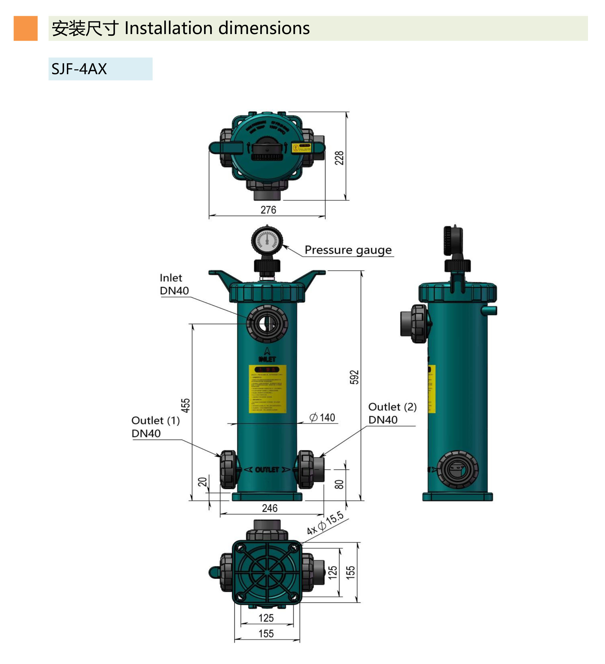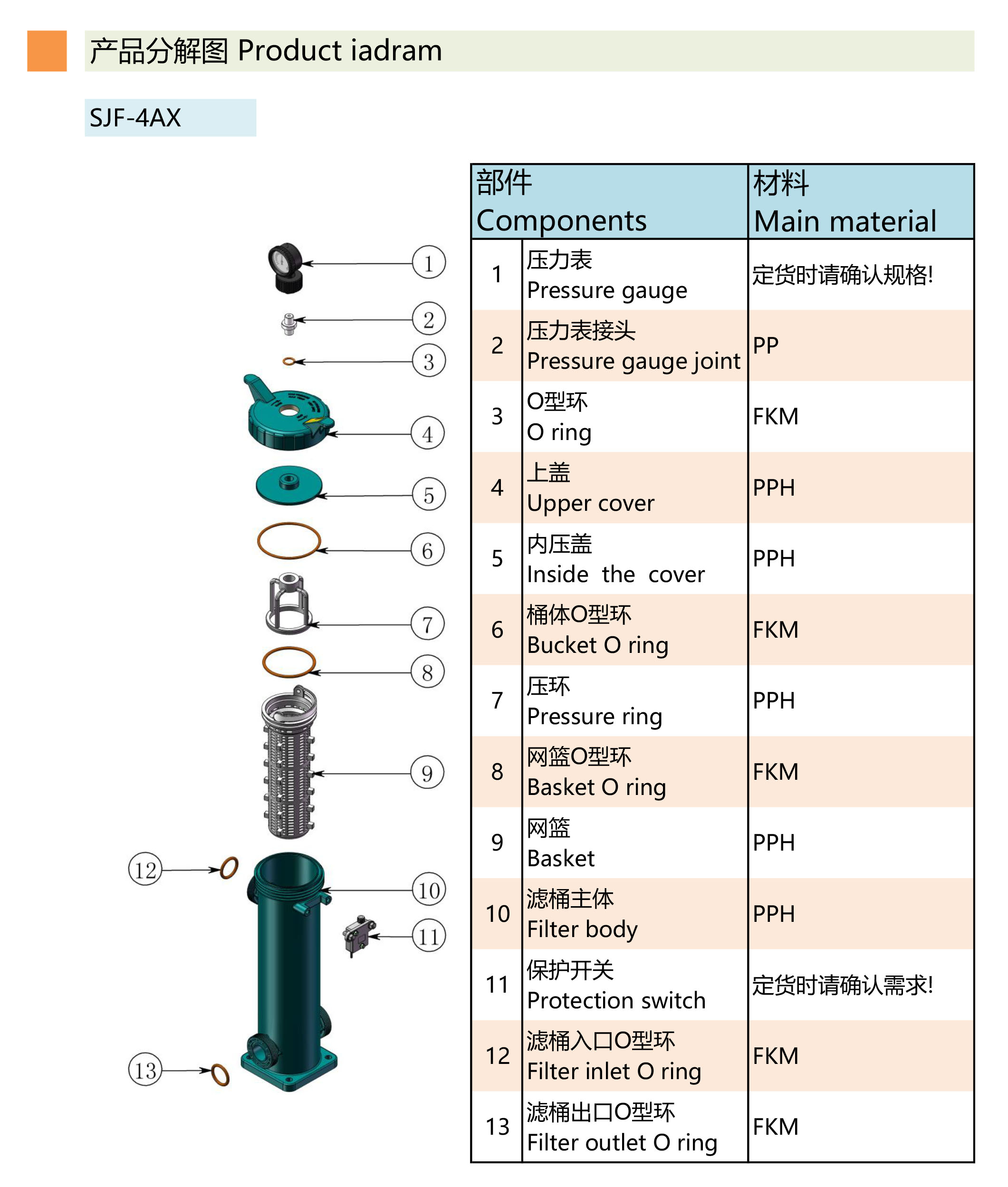 SJF-4AX-40產(chǎn)品特點(diǎn): ●.此過濾器為濾袋式過濾器,配標(biāo)準(zhǔn)4#過濾袋(φ105*380MM)。?也可改裝成10″*1芯的濾芯式過濾器。? ●.此過濾器是按國際通用標(biāo)準(zhǔn)設(shè)計(jì)制造的,能與國際知名品牌(如EATON、FSI、 PALL等)的濾袋相匹配,也能與國內(nèi)標(biāo)準(zhǔn)濾袋相匹配。? ●.桶體采用一體成型設(shè)計(jì),結(jié)構(gòu)堅(jiān)固可靠,無任何焊接點(diǎn),徹底解決漏液之慮。 ●.重量輕,進(jìn)口PPH/PVDF原料一體成型,對絕大多數(shù)化學(xué)品具有很好的抗腐蝕性能??啥ㄖ艵TFE/PFA材質(zhì)。 ●.含有防紫外線材料,使其經(jīng)久耐用,且適合各種氣候下使用。 ●.旋擰上蓋的設(shè)計(jì)使其無需任何工具就可以打開和關(guān)閉濾桶,更換過濾袋方便快捷。 ●.拋光的桶壁設(shè)計(jì)既可防止藥液結(jié)晶于桶壁又便于人工清洗。 ●.增大網(wǎng)籃和桶內(nèi)壁及網(wǎng)籃和桶底部的空間設(shè)計(jì),使液體過濾流道更加暢通無阻,從而減少泵浦能耗。 ●.濾袋環(huán)口與網(wǎng)籃內(nèi)壁之間有密封設(shè)計(jì),網(wǎng)籃上口外壁和桶內(nèi)壁之間也有密封設(shè)計(jì),杜絕桶內(nèi)部泄漏,達(dá) 到精密過濾要求。 ●.適用于壓力87psi(6bar)與溫度158℉(70℃)范圍內(nèi)使用。 ●.進(jìn)出水口采用活接式連接,堅(jiān)固耐用,可配接不同管徑及管材使用。 ●.可適用于0.1-800微米大范圍的過濾精度。 ●.該過濾器可廣范應(yīng)用于城市污水處理、銅粉回收、金回收、化工、石油、生物工程、制藥、電子、電鍍、工業(yè)廢水、海水淡化、印染、造紙等行業(yè)。 此過濾器有中國專利保護(hù),專利號為 ZL 2018 3 0519792.2 仿冒必究!
