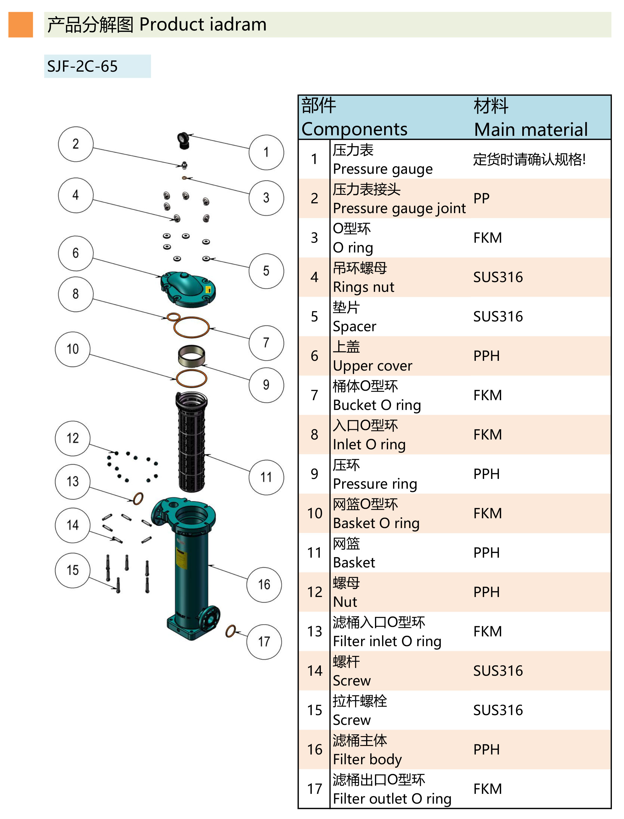 ●.此過濾器為濾袋式過濾器,配標(biāo)準(zhǔn)2#過濾袋(φ180*810MM)。也可裝外徑62MM*30″的濾芯6支, ●.此過濾器是按國(guó)際通用標(biāo)準(zhǔn)設(shè)計(jì)制造的,能與國(guó)際知名品牌(如EATON、FSI、 PALL等)的濾袋相匹配,也能與國(guó)內(nèi)標(biāo)準(zhǔn)濾袋相匹配。?? ●.桶體采用一體成型設(shè)計(jì),結(jié)構(gòu)堅(jiān)固可靠,無任何焊接點(diǎn),徹底解決漏液之慮。 ●.重量輕,進(jìn)口PPH/PVDF原料一體成型,對(duì)絕大多數(shù)化學(xué)品具有很好的抗腐蝕性能。可定制ETFE/PFA材質(zhì)。 ●.含有防紫外線材料,使其經(jīng)久耐用,且適合各種氣候下使用。 ●.旋擰上蓋的設(shè)計(jì)使其無需任何工具就可以打開和關(guān)閉濾桶,更換過濾袋方便快捷。 ●.拋光的桶壁設(shè)計(jì)既可防止藥液結(jié)晶于桶壁又便于人工清洗。 ●.增大網(wǎng)籃和桶內(nèi)壁及網(wǎng)籃和桶底部的空間設(shè)計(jì),使液體過濾流道更加暢通無阻,從而減少泵浦能耗。 ●.濾袋環(huán)口與網(wǎng)籃內(nèi)壁之間有密封設(shè)計(jì),網(wǎng)籃上口外壁和桶內(nèi)壁之間也有密封設(shè)計(jì),杜絕桶內(nèi)部泄漏,達(dá) 到精密過濾要求。 ●.適用于壓力116psi(8bar)與溫度176℉(80℃)范圍內(nèi)使用。 ●.進(jìn)出水口采用法蘭式連接,堅(jiān)固耐用,可配各國(guó)標(biāo)準(zhǔn)管道法蘭使用。 ●.可適用于0.1-800微米大范圍的過濾精度。 ●.該過濾器可廣范應(yīng)用于城市污水處理、銅粉回收、金回收、化工、石油、生物工程、制藥、電子、電鍍、工業(yè)廢水、海水淡化、印染、造紙等行業(yè)。 此過濾器有中國(guó)專利保護(hù),專利號(hào)為ZL 2018 3 0519793.7 仿冒必究!